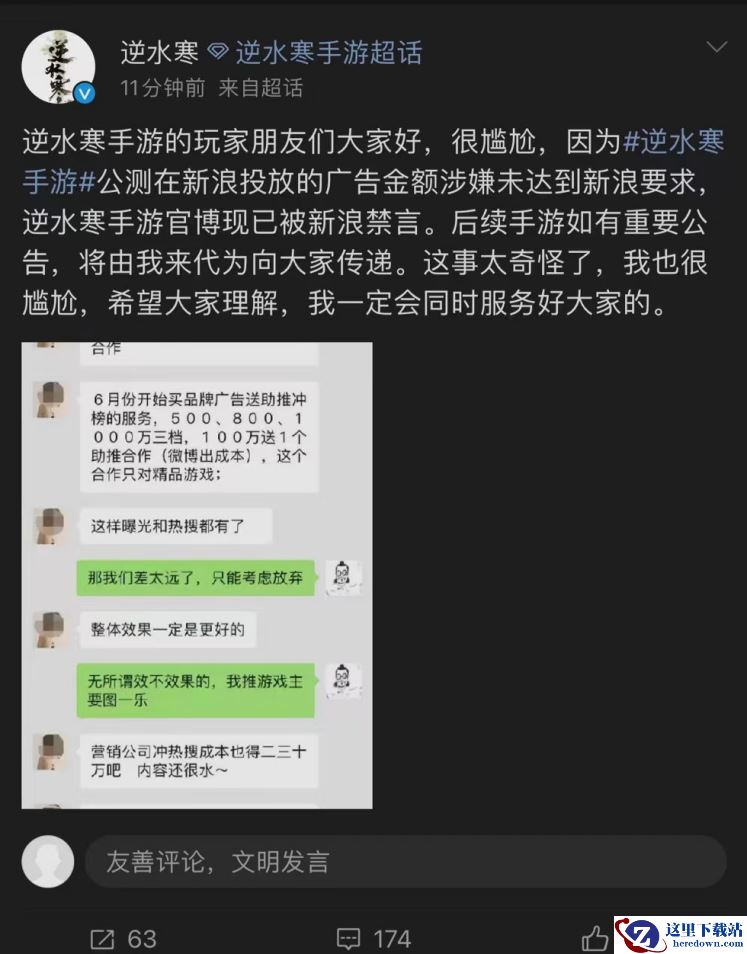而被阶段性禁言了的《逆水寒》手游官方,则在游戏的超话里给出了自己的回应,称真正的禁言原因是《逆水寒》手游在正式公测时,在微博上投放的广告金额规格没有达到新浪方面的要求,因此才会被新浪给禁言。为了证明他们所说的有足够的可信度,他们还附上了与新浪方面的聊天记录。