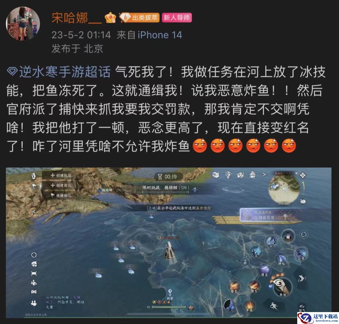 有时候就算无意,也会触犯游戏中的通缉:比如某玩家下河抓锦鲤,用寒冰护体技能冻死了河里十条鱼,就可能犯了恶意炸鱼罪,也是要乖乖交罚款才行的。