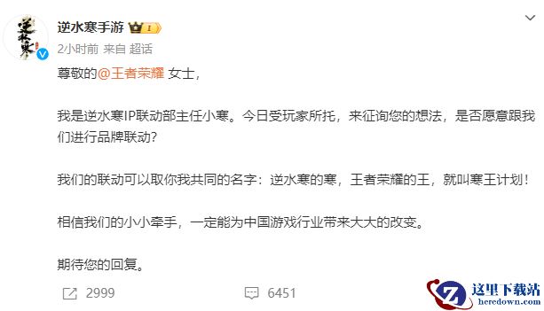 今日下午,网易旗舰武侠开放世界《逆水寒》手游微博发文称,根据玩家投票结果,希望与腾讯旗下的国民MOBA游戏《王者荣耀》进行联动。连合作名称都想好了,取逆水寒的“寒”,王者荣耀的“王”,叫“寒王计划”。