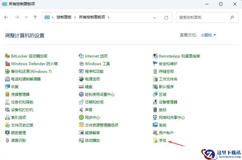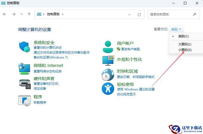 1、首先,打开Win11系统的控制面板界面,并把“查看方式”设置为“小图标”。