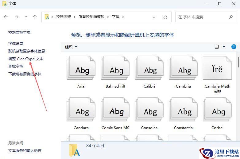 3、接着,在打开的界面中,点击左侧的“调整Clear Type文本”选项。