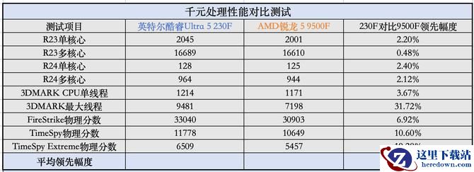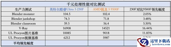 通过上面的实际测试的结果来看的话,我们能够清晰地看到,英特尔酷睿Ultra 5 230F的平均领先幅度依旧达到了7.18%,不论是后期的建模、渲染,还是图片、视频创作方面,英特尔酷睿Ultra 5 230F都能为内容创作者提供更强的性能表现。