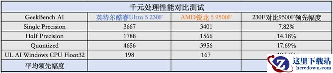 AI性能表现方面,我们选择GeekBench AI进行测试,可以看到酷睿Ultra 5 230F的AI算力方面表现出色,AI同样出色。