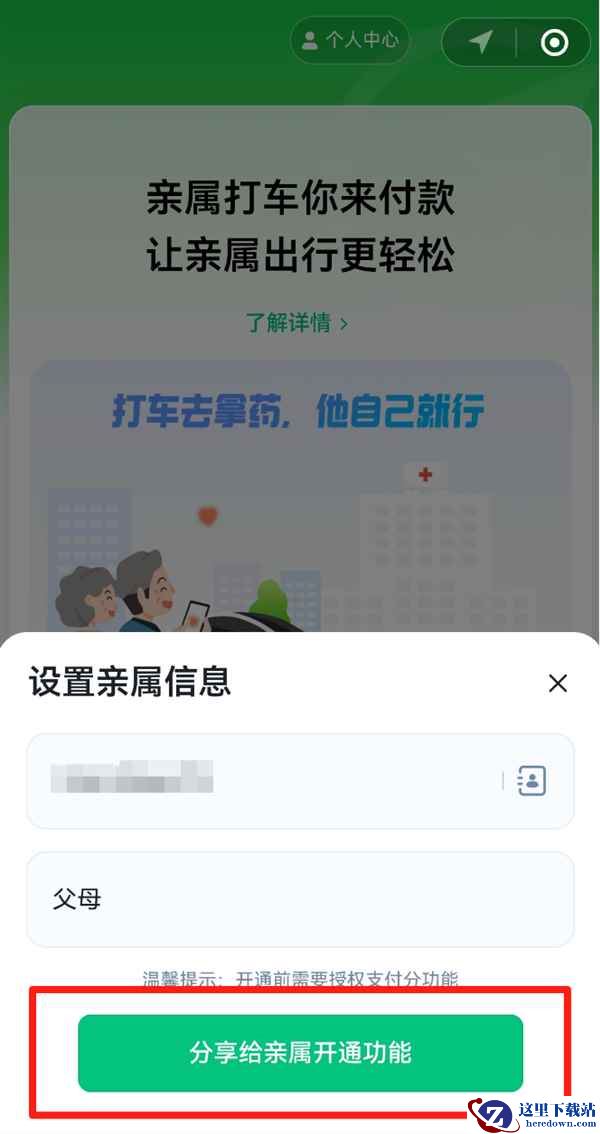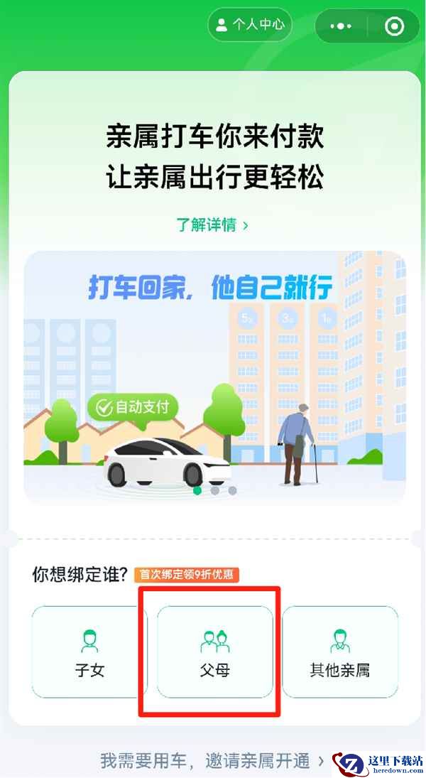 子女在微信里搜索「亲属打车」,选择「父母」作为绑定对象,填写父母的手机号和亲属关系,完成基础信息设置;
