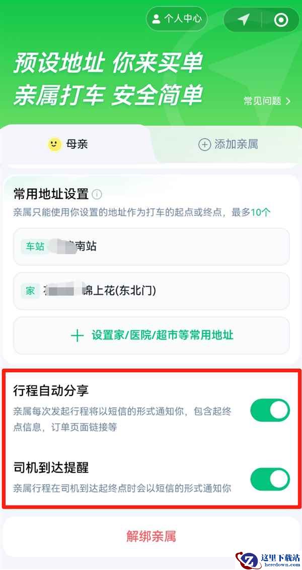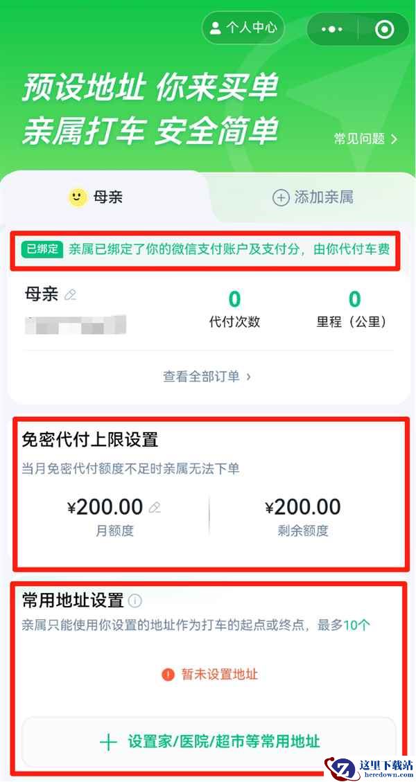 绑定完成后,子女可设置免密代付额度(默认上限200元),并添加家、医院、车站等常用上下车地点。