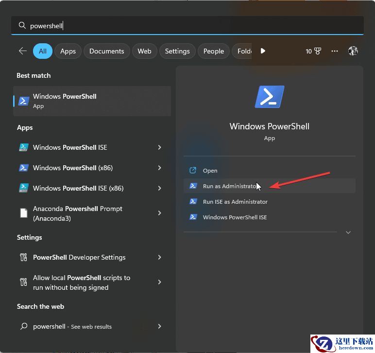 1.按 Windows 键,键入 PowerShell ,然后选择以管理员身份运行。