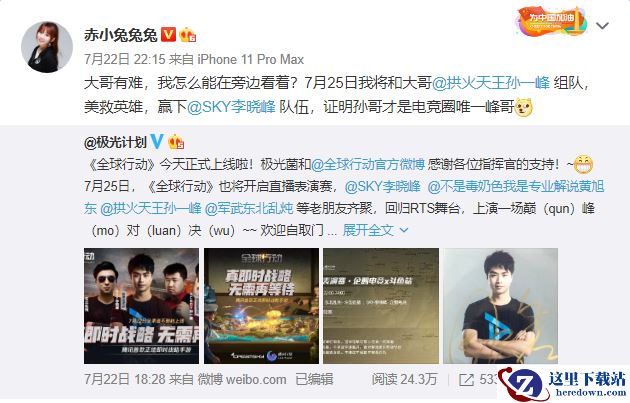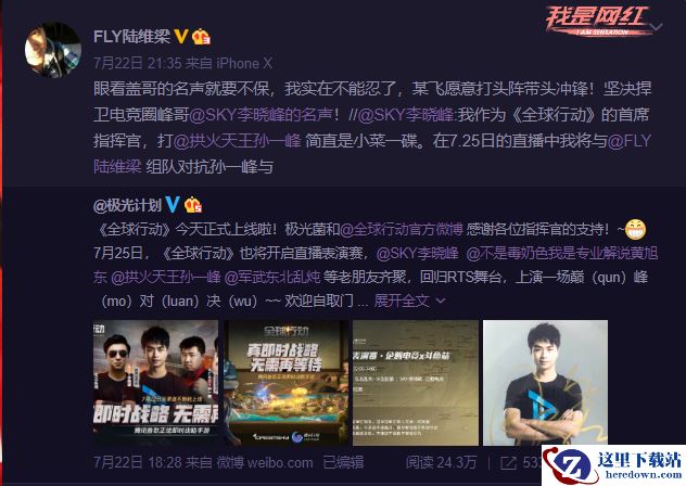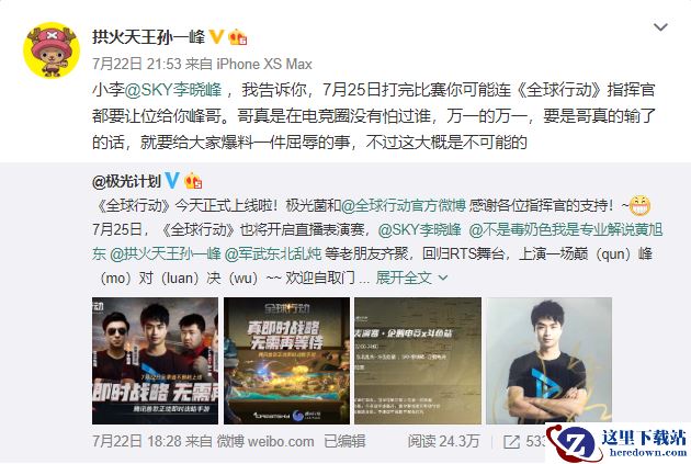 昨天晚上,专业解说黄旭东在微博曝出重磅“内幕”消息:SKY李晓峰约战了SCBOY,说 7月25日晚23点-24点在《全球行动》中一较高下,势要角逐比拼“谁才是电竞圈唯一峰哥”!