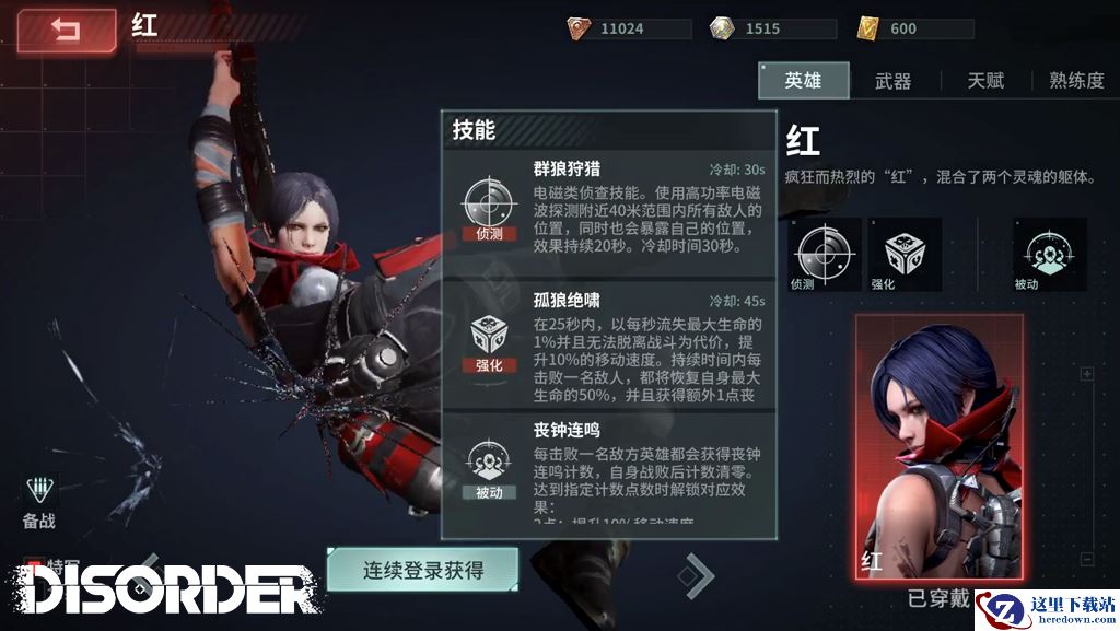 在此前测试中,《Disorder》已为玩家提供了二十余位各具特色的英雄。当来自亡者连队的新角色“红”首次加入战场,其极为优秀的偷袭和攻击能力,为玩家提供了更多战术选择空间。团队作战时,玩家可使用红的“孤狼绝啸”以极快的速度撕裂对方防守;躲在暗处使用“群狼狩猎”侦察大范围所有敌人位置,让队友逐个击破,也是完美的战术选择之一。