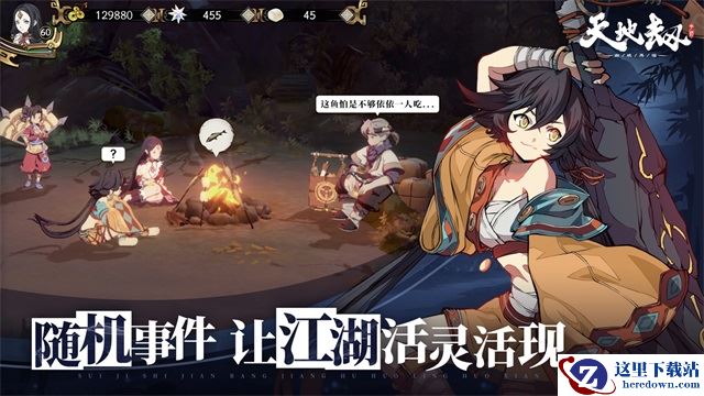 在游戏玩法上加入变幻莫测的随机事件,让江湖更加活灵活现,在进行完一天的征途后,还可以在山林间、小河畔生起篝火扎营,体力不足时抓一两条鱼烤来吃再好不过。在营地里角色之间还可以互相对话,点击人物头顶的小气泡则可以开始互动,通过交谈可以增加阅历值,有时候还能获得或解锁一些隐藏信息及特殊关卡。
