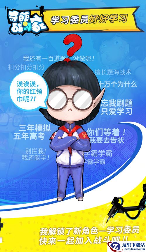 小时候脑力超群又爱告状的“学习委员”也隆重登场,每天不是看五年高考就是三年模拟,除了忘我刷题没有其他爱好,厚厚眼镜下其实蕴含着大大的能量,刷题搞怪大招书本满天飞,让人无处可逃。
