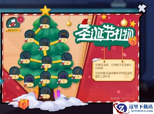 12.21-12.28期间。通过开启钥匙宝箱就能够收集圣诞袜,消耗圣诞袜按照顺序领取圣诞树上的奖励,离起点越远的地方,奖励价值越高哦!