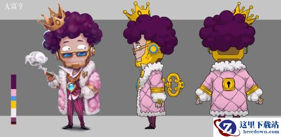 一头乱糟糟的爆炸头也染成了高贵的紫色,并戴上以闪瞎小工狗眼的纯金王冠,以前单薄的工作服白大褂也换成了粉红色的貂绒外套,外加胸前那大到夸张的蓝宝石,内衬不再是铁皮壳子而是换上了紧致的亮红色西装,身后巨大的发条保留了他作为一个科技狂魔改造自己的证据