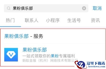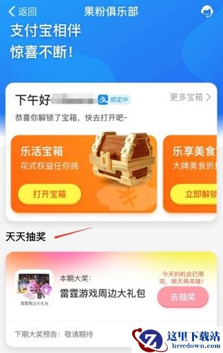 打开支付宝APP搜索“果粉俱乐部”,进入天天抽奖页面。