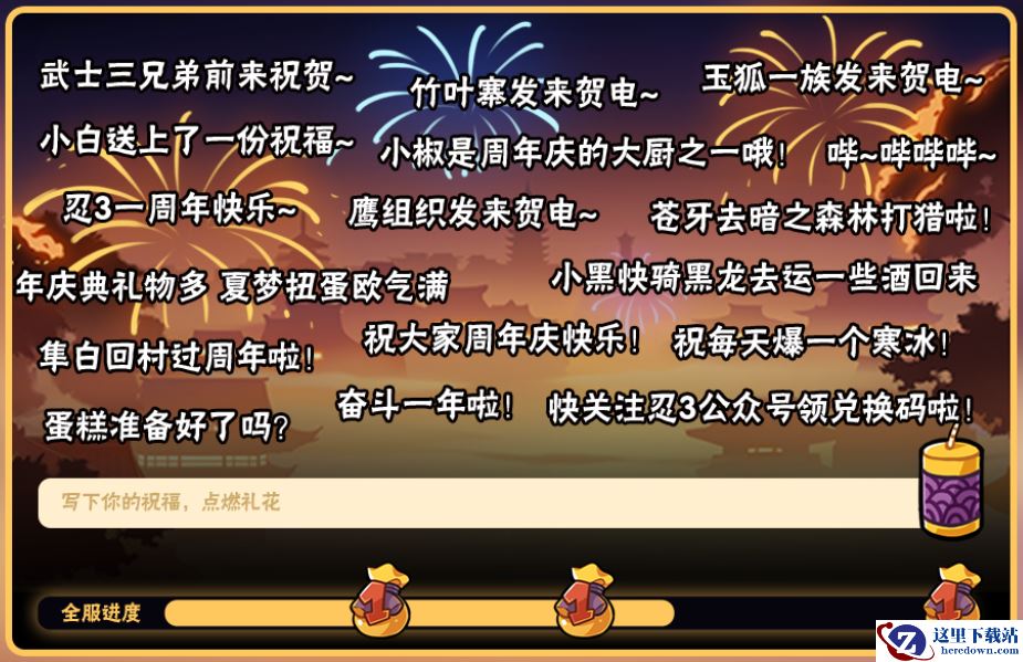 对于在8月23日至8月25日进入正题的周年庆典,都将围绕着需要全服忍忍们共同参与的“全服生日祝福”展开。首先,忍忍们进行祝福,首次可以获得有效期30天的周年庆限定聊天气泡;当祝福累积到一定进度便可以领取周年庆专属头像,而且还能免费领取随机道具奖励、庆典币甚至是周年庆限定抱枕;而当达成祝福目标后,登录游戏的忍忍们便可以领取一个可以让任意角色直升一级的——庆生蛋糕,这个蛋糕可以永久有效的,留待以后用也是可以的。此外,在庆典的三天内,只要登录游戏每天都可以领取到神秘礼包哦!