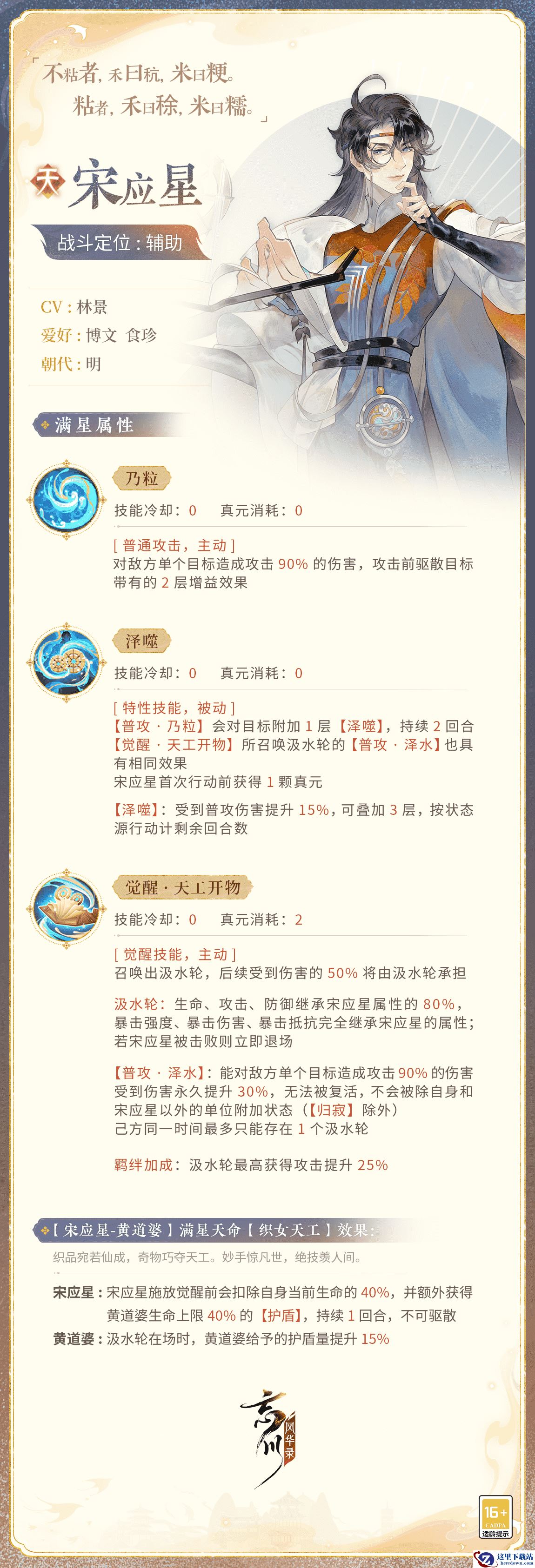 宋应星在忘川中战斗作为辅助出战!普通攻击,对敌方单个目标造成伤害,并在攻击前驱散目标带有的两层增益。特性技能会为普攻命中目标附加一层【泽噬】效果,后续该目标受到普攻伤害提升15%,可叠加3层,觉醒技能召唤的汲水轮普攻也会具有同样的效果,同时宋应星首次行动前获得1颗真元。觉醒技能会召唤出汲水轮,后续宋应星受到50%伤害由汲水轮承担。汲水轮继承一部分宋应星的属性,但受到伤害永久提升30%,且无法被复活,同一时间最多存在一个汲水轮。