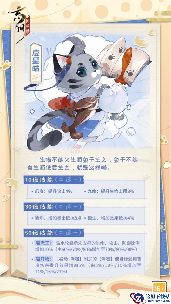 应星喵等级提升至10/30/50级时,会得到不同的效果提升。等级提升至50级时,即可解锁技能【喵天工】或【喵开物】,大幅提升宋应星的作战能力。宋应星作为辅助名士加入忘川,普通攻击可以驱散敌方增益,特性技能可以使敌方受到普通攻击伤害增加,觉醒技能可以召唤汲水轮进行攻击。装备推荐:承佑套,猫技能推荐第二条,阵容推荐宋应星、杨玉环、高长恭、曹植、赵匡胤。