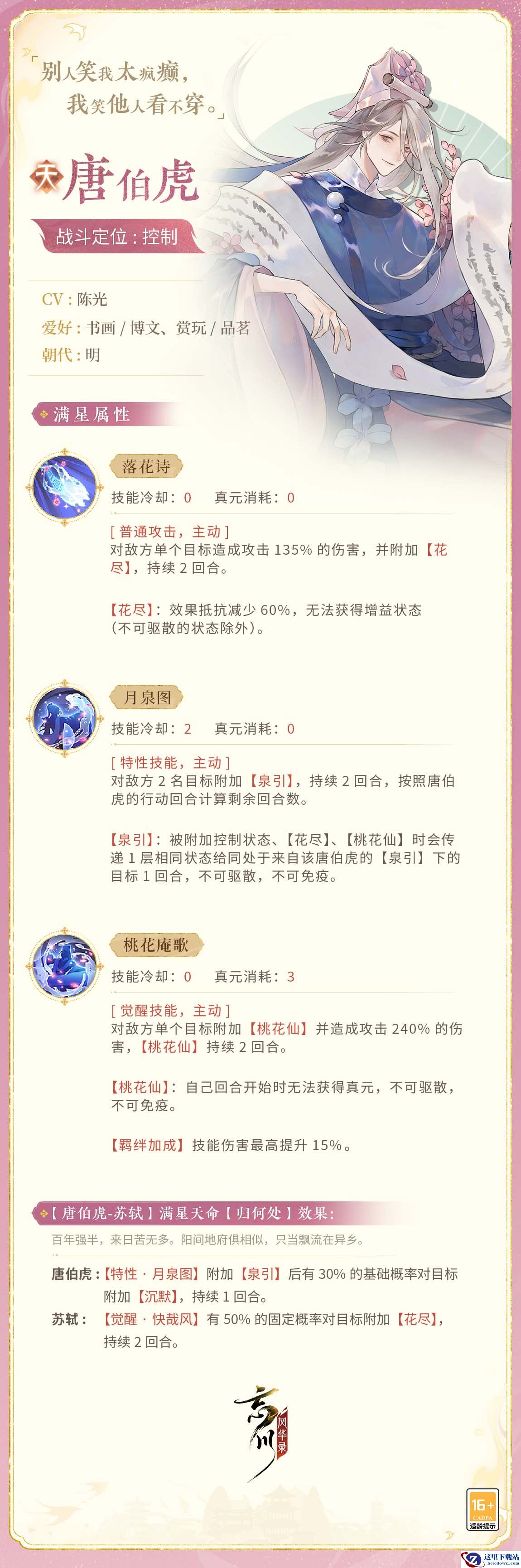 唐伯虎在战斗中作为控制出战!他以技能【落花诗】为普通攻击,【月泉图】为特性技能,【桃花庵歌】为觉醒技能,触发羁绊时技能伤害最高提升15%,风露清愁,俊秀清雅!