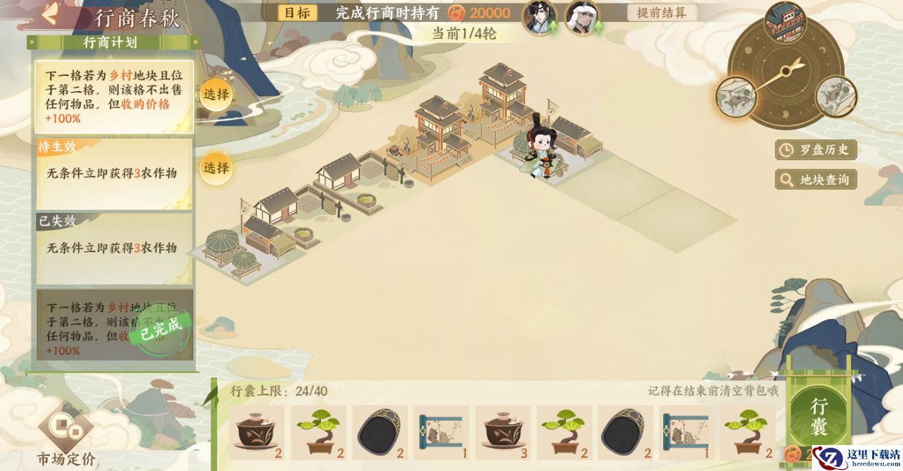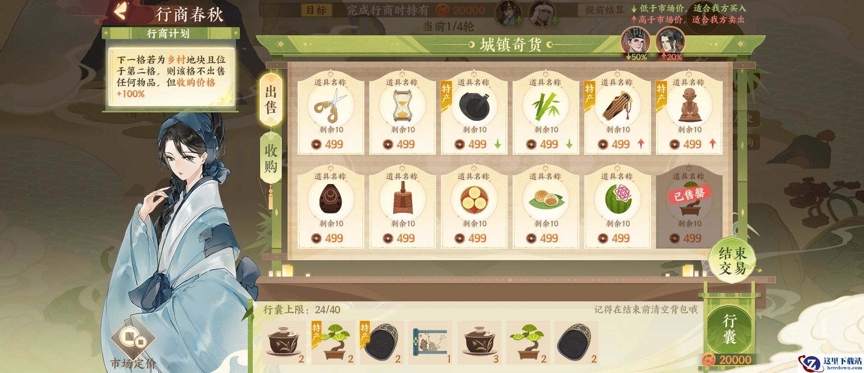 变幻莫测的市场风向和复杂多变的市场环境,是经商途中必须面对的两大难点。行商春秋玩法便对其进行了还原呈现——行商途中,地图上的地块均为隐藏状态,使君们只能通过“商机罗盘”的指针方向,获悉未来3个地块中城镇、乡村与稻田的多寡关系,并借助这一线索,对自己在当前地块的购销策略进行调整;城镇、乡村、稻田三种地块均可进行相应商品的购买和出售,但商品的种类和价格不尽相同,且在动态变化,使君们需要低价购入,高价卖出,方能积累财富。