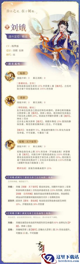 技能介绍:刘娥作为输出名士在忘川中作战,普通攻击会扣除自身当前血量15%并对1名目标造成195%的伤害,同时获得1层【娥月】,降低受到群攻输出15%。当持有【娥月】效果时,攻击提升5%并且造成伤害的5%会转化为吸血效果,可叠加7层。特性技能每当友方单位在自身回合内扣除血量时,刘娥和友方单位都会获得1层【娥月】,持续2回合。觉醒技能释放前会扣除自身血量30%,并对敌方名士造成330%的伤害,若该伤害使敌方名士血量低于50%则会对另一个随机目标造成220%的伤害。
