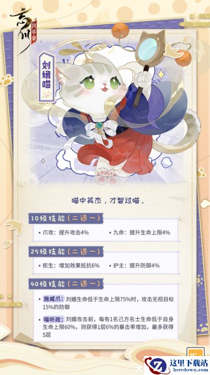 鼗鼓动,喵声响,喵中英杰,刘娥喵登场!刘娥喵才智机敏,通晓史书。若说刘娥是女中英杰,那么刘娥喵就是当之无愧的喵中英杰。刘娥喵不仅多才,也多艺。它也善于播鼗鼓,且深得刘娥的真传,每当刘娥喵播响鼗鼓时,众喵们皆会为其沉醉。