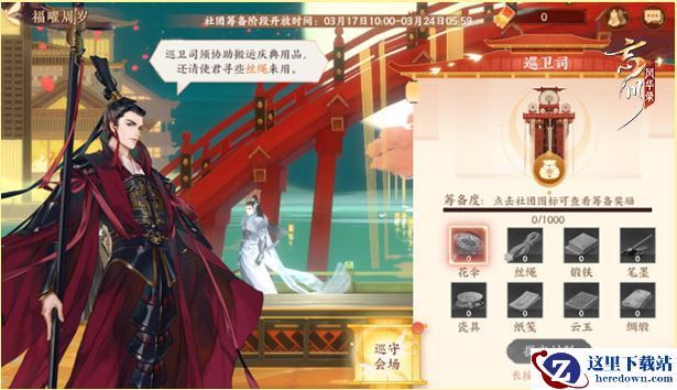 活动内容:玩家“使君”在3月17日维护后—3月24日5:59期间参与故世风云、宝墟、镜渊等副本玩法,均有概率获取各社团所需的筹备材料,如丝绳、锻铁、笔墨、瓷具、纸笺、云玉、绸缎、花伞。玩家“使君”可将材料提交给庆典会场的社团负责人,获得相应的社团筹备度。完成【巡卫司】指定任务,可获得稀有材料【花伞】,同样可以获得筹备度!玩家“使君”可领取活动限定家具、限定称号、喵饰品哦!