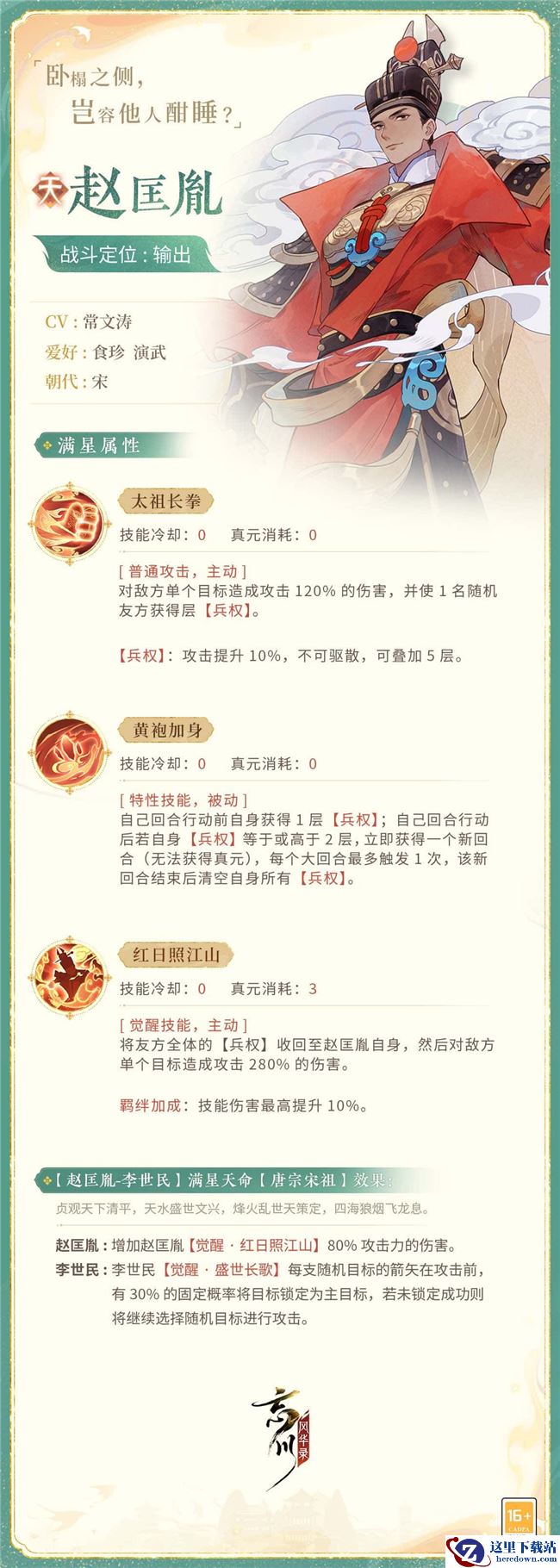 赵匡胤在战斗中作为输出出战!他以技能【太祖长拳】为普通攻击,【黄袍加身】为特性技能,【红日照江山】为觉醒技能,触发羁绊时技能伤害最高提升10%,驯烈马,游四方!