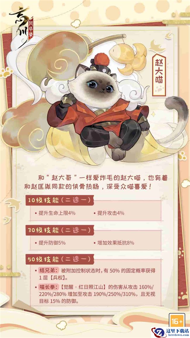 赵大喵等级提升至10级时,可解锁技能:提升生命上限4%或提升攻击4%;等级提升至30级时,可解锁技能:提升防御5%或增加效果抵抗8%:等级提升至50级时,即可解锁技能【结兄弟】或【喵长拳】。