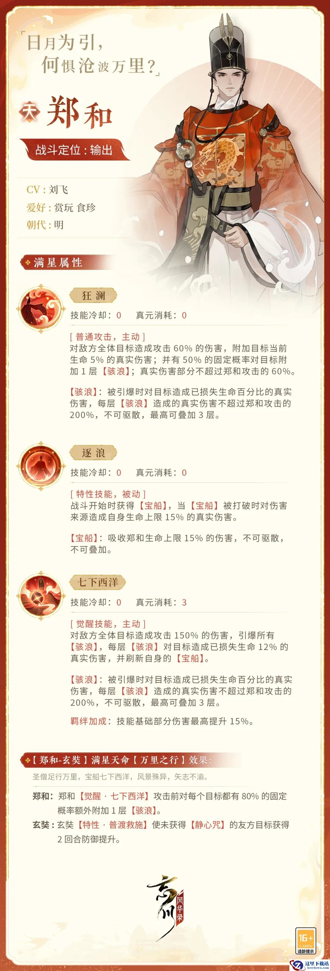 郑和以罗盘为武器,在战斗中作为输出出战!他以技能【狂澜】为普通攻击,【逐浪】为特性技能,【七下西洋】为觉醒技能,触发羁绊时技能基础部分伤害最高提升15%,身为酷爱冒险的输出名士,郑和定会痛击敌方!