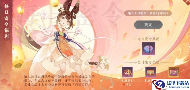 玩家在微信公众号【福利上门】-【每日签到】处签到后登录游戏,于【忘川布告】-【每日密令福利】或个人中心的【密令】中输入今日密令,即可领取奖励礼包!密令有效时间为当天发布后至当晚12时,逾期将会失效。