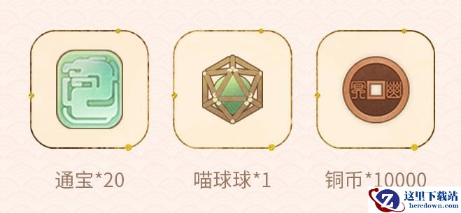 每周累计签到3次必得通宝*20、喵球球*1、铜币*10000。