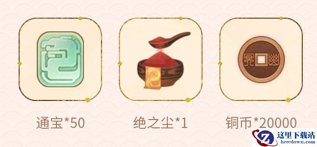 每周累计签到7次必得通宝*50、绝之尘*1、铜币*20000。
