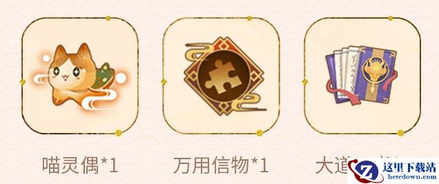 总共累计签到30次必得喵灵偶*1、万用信物*1、大道天书*1。