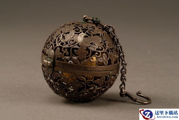 秘灵银琰,力量与生命的本源为葡萄花鸟纹银香囊。香囊外壁为银制,呈镂空圆球形,以中部水平线为界分割为两个半球形,作燃放固体香料之用。香囊的平衡构造原理与现代陀螺仪相近,无论如何转动,香料都不会倾洒而出,体现了极高的工艺水平。华丽精巧的葡萄花鸟纹银香囊彰显了大唐盛世的开放包容、繁荣昌盛,同时也是丝绸之路与西域文化交流的结果。