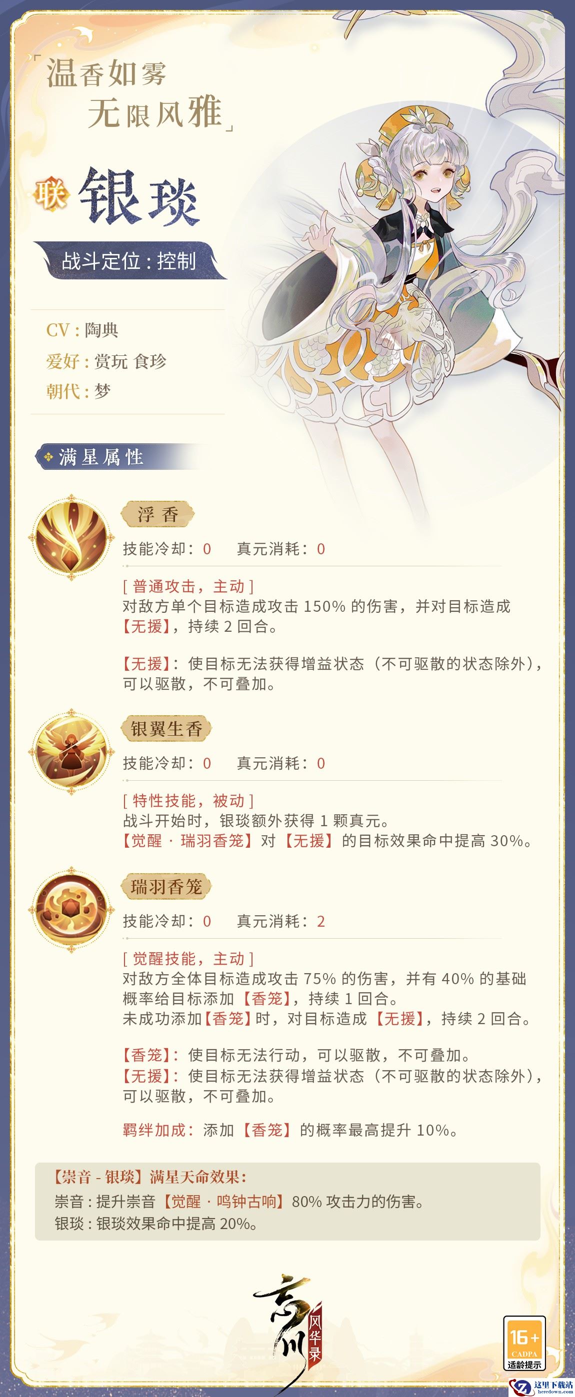 银琰作为联动秘灵,在战斗中承担控制角色!她以技能【浮香】为普通攻击,【银翼生香】为被动技能,【瑞羽香笼】为觉醒技能,触发羁绊时添加【香笼】的概率最高提升10%,与秘灵崇音触发天命时,命中效果提高20%,强势压制胜券在握!