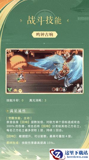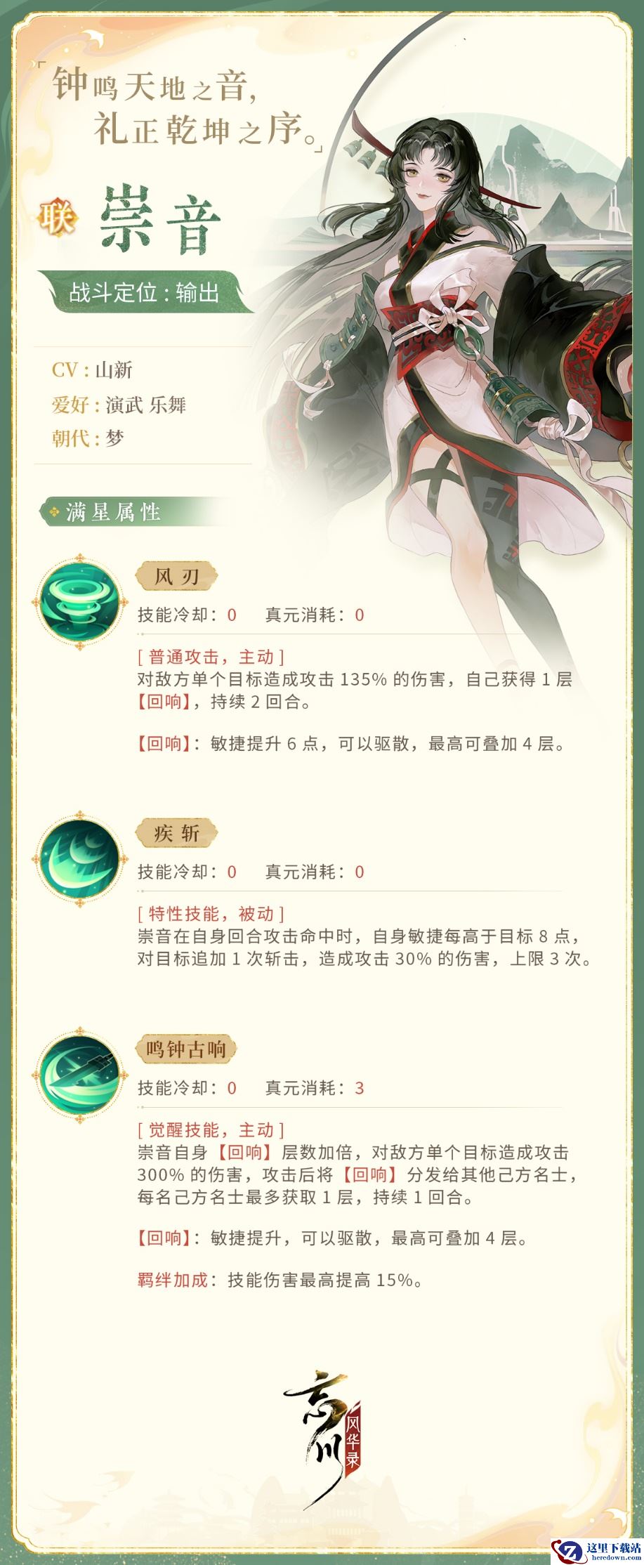 崇音作为联动秘灵,在战斗中作为输出出战!她以技能【风刃】为普通攻击,【疾斩】为被动技能,【鸣钟古响】为觉醒技能,触发羁绊时技能伤害最高提高15%,强力输出一招制胜!