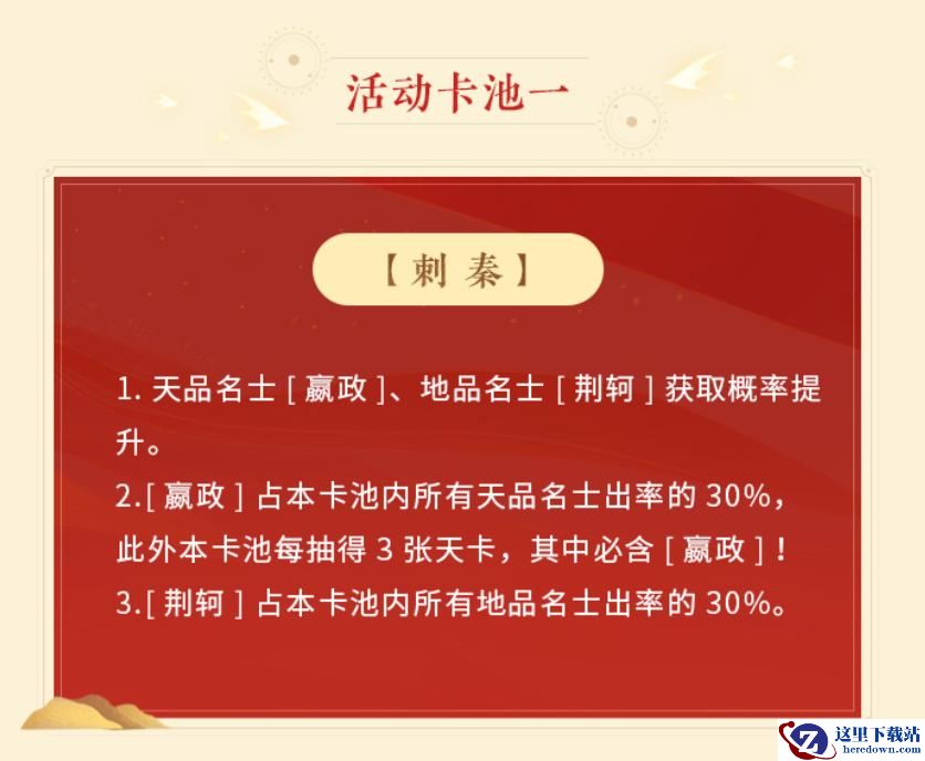 在本卡池中,天品名士嬴政与地品名士荆轲的获取概率大大提升!各位“使君”可在此卡池中使用喵灵偶进行寻英,与二位名士相遇,共战忘川!