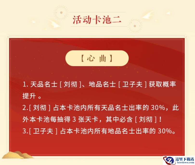 在此活动卡池内,各位玩家“使君”将有更高机率获得天品名士刘彻和地品名士卫子夫!各位“使君”可前往卡池参与寻英,获取两位名士星灵之力!