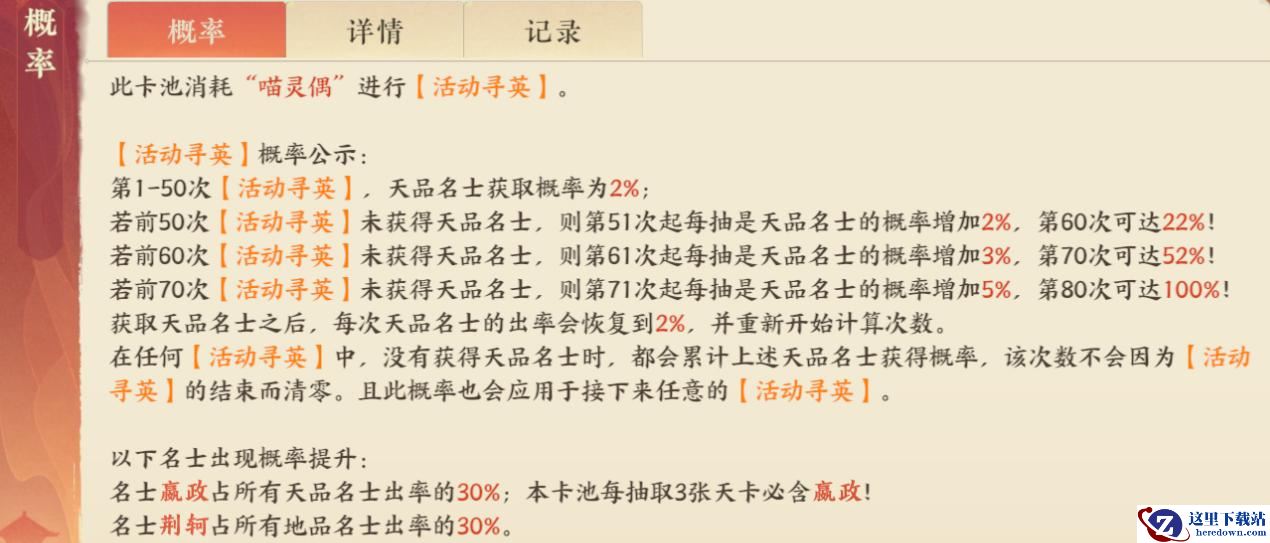在本次活动卡池中寻英,累计50抽没有获得天品名士时,会累计增加此后获得天品名士的概率,累计概率在任意活动卡池内共享(包含此后的新活动卡池),具体数值可通过寻英界面卡池详情查看!