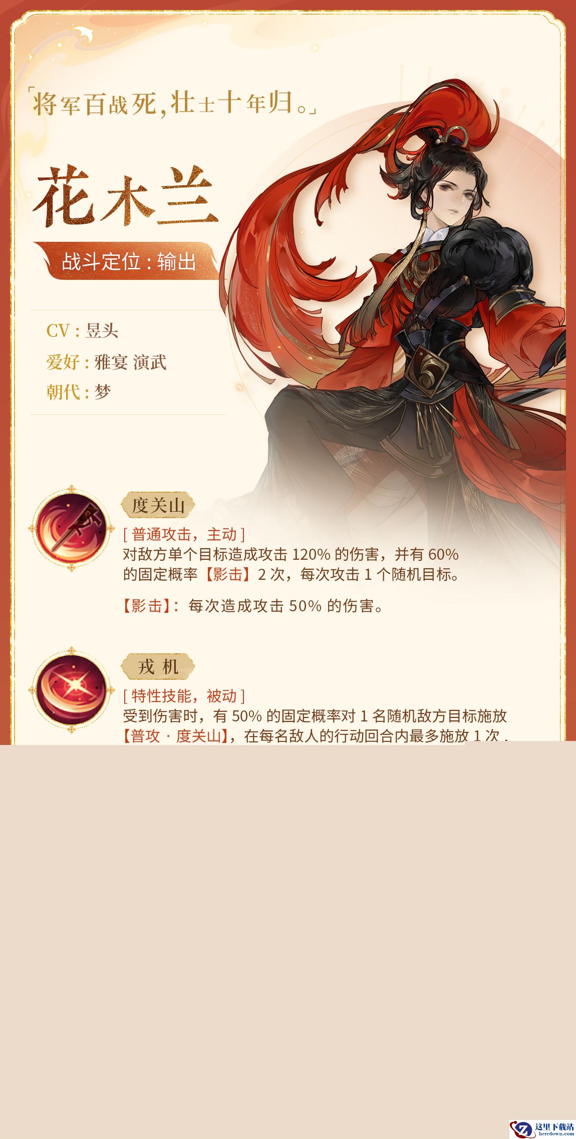 花木兰是忘川天品名士之一,好演武、喜雅宴,在战斗中作为输出制敌,以技能【度观山】为普通攻击,【戎机】为被动特性技能,【觉醒·木兰诗】为觉醒技能,长剑鸣彻峥嵘忘川。