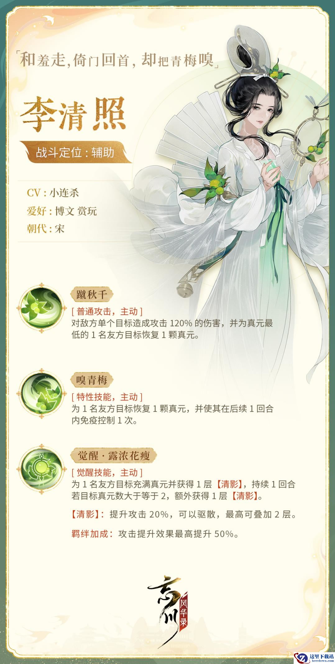 李清照作为忘川天品名士之一,在战场上作为辅助出战,协助其他名士更好作战。以技能【蹴秋千】为普通攻击,【嗅青梅】为被动特性技能,【觉醒·露浓花瘦】为觉醒技能,非凡风姿力压劲敌!