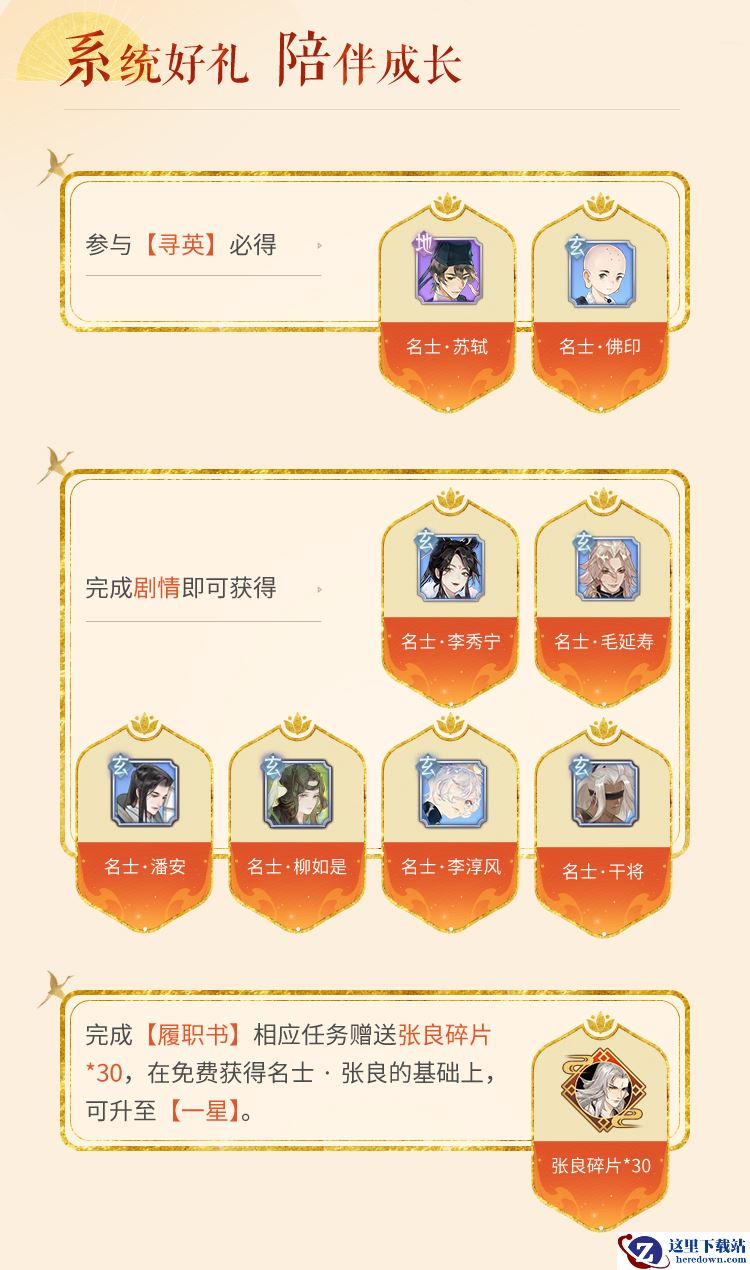 履职与升级,喵灵名士直接送!今日公测开启后,玩家“使君”参与【寻英】必得名士苏轼与佛印;完成剧情还可获得李秀宁等六位名士;玩家“使君”升级至30级时,共可获得喵灵偶*30;在10级-40级期间,每升5级时还可获得多重成长好礼;完成【履职书】任务可以获得喵灵偶*20、张良碎片*30、通宝、名士信物、极品灵器、纪念头像框等珍稀奖励。