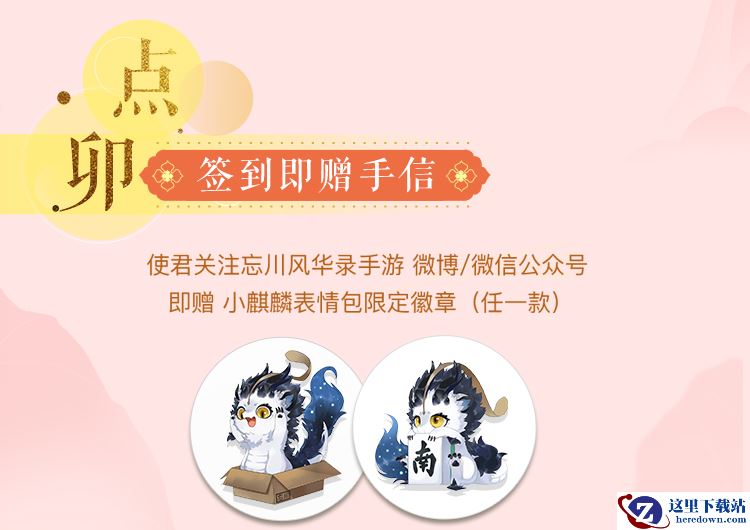 使君关注忘川风华录手游官方微博/微信/B站账号,即赠小麒麟表情包限定徽章(任一款)。