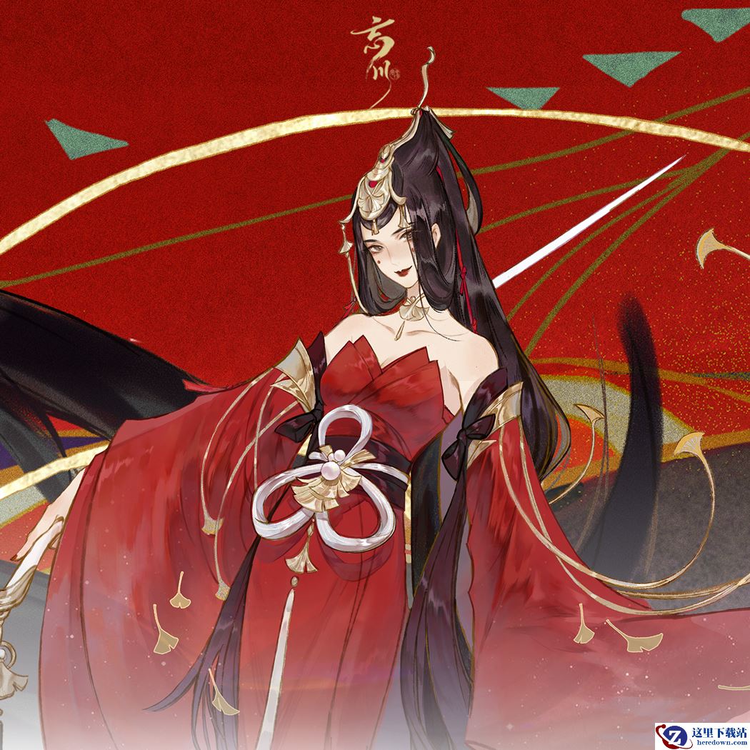 “有美人名虞”,似远山含黛的娥眉下天生一双含情眸,红唇明艳神情娇美,容色倾城且才艺并重。虞姬佩有一双狭长精巧的秋水鸳鸯剑,相传她在四面楚歌之境以剑舞与项羽相和,留下《和垓下歌》的绝响。剑于她而言,是女儿飒爽,也是宁为玉碎的英雄之兵。一席明艳炽烈的正红色舞裙曾洁白如雪,在她拔剑自刎后被鲜血染红。广袖飒飒身姿曼妙,衬托出容色如花。纤细的腰肢间挽着素白的攀缘结,虞姬和项羽从年少相识到成王败寇一路相伴,这份坚守如绳结般看似柔软易折实则坚定稳固。衣裙和冠带皆以形似爱心的银杏为饰,寓意着一生相守的爱情,也是虞姬至死追随项羽的写照。