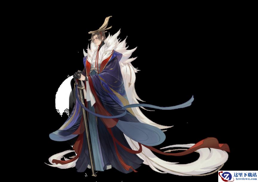 秦朝尚黑属水,嬴政头戴鎏金飞尾发冠,身着自绀紫色渐变至玄黑色的龙袍,其上水波暗纹低调内敛,暗指深不可测的帝王之心。暗红的绶带意为他自宫闱质子走来的荆棘之路。印有古代钱币纹样的白色里衣和取色于万里长城的青灰蔽膝,呼应他统一货币、建造长城的政治成就。肩头的白羽龙鳞披饰则呼应着祖龙千古一帝的称号。他手中持着有“天下第一剑”之称的定秦剑,昭示着始皇帝横扫六合的千秋功绩。