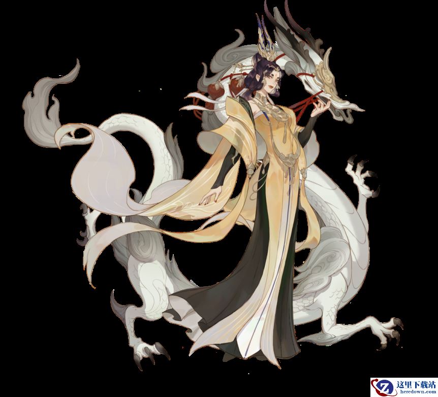 武则天头戴点翠凤鸣发冠,华丽的发髻之上蓝金映衬,凤凰振羽眼神睥睨。流云纹绣凤袍勾勒出妩媚的身姿,利落的护手和黑色劲靴在丰润飘逸中透着杀伐果断的决绝。眉间一簇凤火花钿灼灼绽放,搭配橙红色系的眼妆、女王色的口脂和霸气时髦的桂叶眉,张扬着一代女皇的真国色。她身后的白龙身环蟠龙,洁白灵动,意喻武则天所修“天枢柱”,标志着武周帝国的盛世王朝。