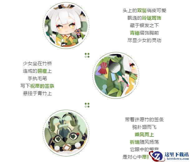竹林深处里似乎传来了鸣叫声和欢笑声;仔细聆听,声音逐渐明朗倏而,双翼平展的身影从竹林中掠了出来!原来是鸮正带着换上新装的薰四处玩耍,青竹上的祈愿签条也因薰的嬉戏打闹而摇晃飘动着!