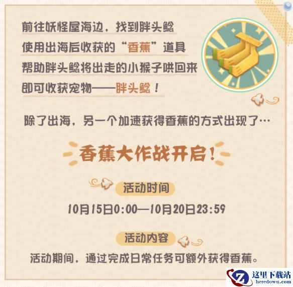 活动期间,完成日常任务可额外获得香蕉。香蕉用于解锁宠物胖头鲶。