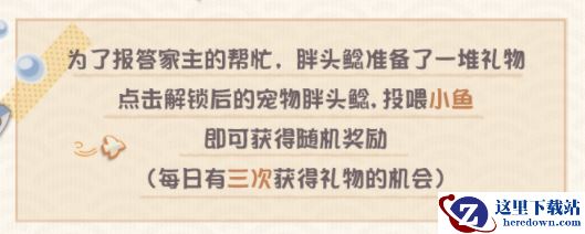 在解锁宠物胖头鲶后,家主们千万不要忘记每天去给它投喂小鱼并获取奖励哦!