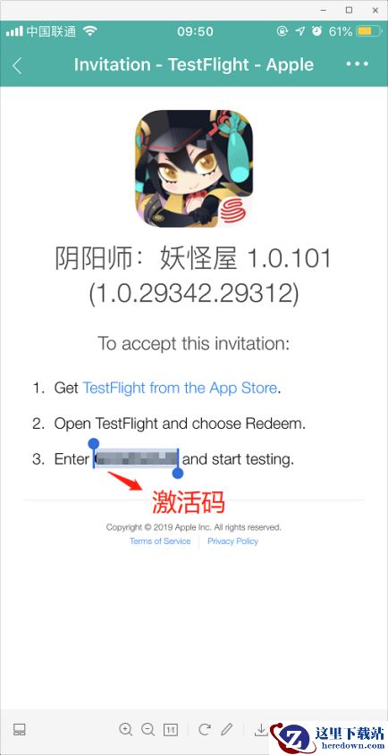 打开您预约游戏时留下的邮箱,找到发件人为TestFlight的激活码邮件并打开,复制说明页面中的激活码。