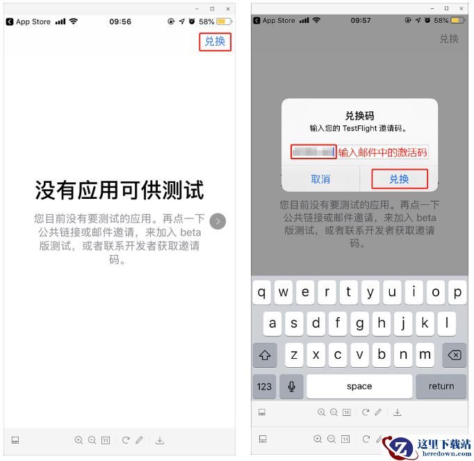 打开TestFlight,点击右上角的“兑换”,输入从激活码邮件中获取的激活码。